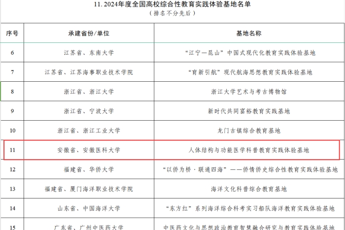 近日,教育部办公厅公布2024年度高校思想政治工作质量提升综合改革与精品建设项目名单,经组织推荐、资格审核、专家遴选、结果公示等程序,我校人体结构与功能医学科普教育实践体验基地,入选2024年度全国高校综合性教育实践体验基地。