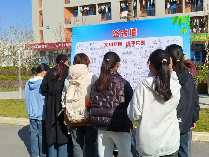 现场气氛热烈,往来师生认真学习了解道路交通安全法律法规和交通安全出行知识,并在签名墙上郑重签下名字,承诺今后出行时会遵守交通安全法律法规,自觉摒弃各种交通陋习,抵制各种不文明交通违法行为。